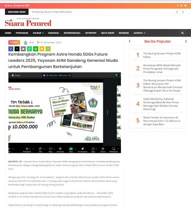 Kembangkan Program Astra Honda SDGs Future Leaders 2025, Yayasan AHM Gandeng Generasi Muda untuk Pembangunan Berkelanjutan by masmul 7 Desember 2025 in Silahkan kunjungi https://www.suarapemredkalbar.com/read/potret/07122025/kembangkan-program-astra-honda-sdgs-future-leaders-2025-yayasan-ahm-gandeng-generasi-muda-untuk-pembangunan-berkelanjutan. You Might Like Regional Public Launching New ADV160 The SUV Pride Grand Launching New PCX 160 Truly Exceptional! Tetap hati-hati ya bro sist berkendara saat hujan.