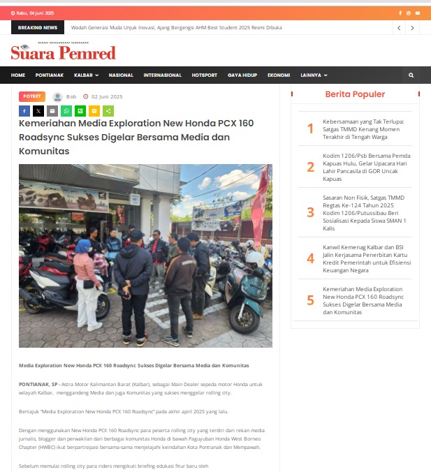 Kemeriahan Media Exploration New Honda PCX 160 Roadsync Sukses Digelar Bersama Media dan Komunitas by masmul 2 Juni 2025 in Silahkan kunjungi https://www.suarapemredkalbar.com/read/potret/02062025/kemeriahan-media-exploration-new-honda-pcx-160-roadsync-sukses-digelar-bersama-media-dan-komunitas. You Might Like Regional Public Launching New ADV160 The SUV Pride Grand Launching New PCX 160 Truly Exceptional! Tetap hati-hati ya bro sist berkendara saat hujan.