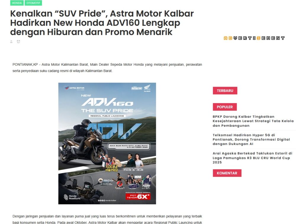 Kenalkan “SUV Pride”, Astra Motor Kalbar Hadirkan New Honda ADV160 Lengkap dengan Hiburan dan Promo Menarik by Muhammad Arif 3 Oktober 2025 in Silahkan kunjungi https://www.kapuaspost.web.id/2025/10/kenalkan-suv-pride-astra-motor-kalbar.html. Tags: astra Astra Motor kalbar Astra Motor Pontianak astramotor honda kalbar pontianak sepeda motor You Might Like Regional Public Launching New ADV160 The SUV Pride Grand Launching New PCX 160 Truly Exceptional! Tetap hati-hati ya bro sist berkendara saat hujan.