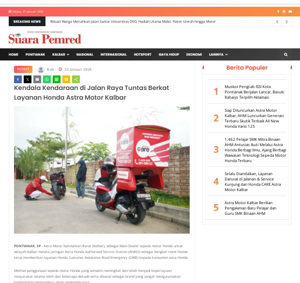 Kendala Kendaraan di Jalan Raya Tuntas Berkat Layanan Honda Astra Motor Kalbar by masmul 22 Januari 2026 in Silahkan kunjungi https://www.suarapemredkalbar.com/read/potret/22012026/kendala-kendaraan-di-jalan-raya-tuntas-berkat-layanan-honda-astra-motor-kalbar. You Might Like Regional Public Launching New ADV160 The SUV Pride Grand Launching New PCX 160 Truly Exceptional! Tetap hati-hati ya bro sist berkendara saat hujan.