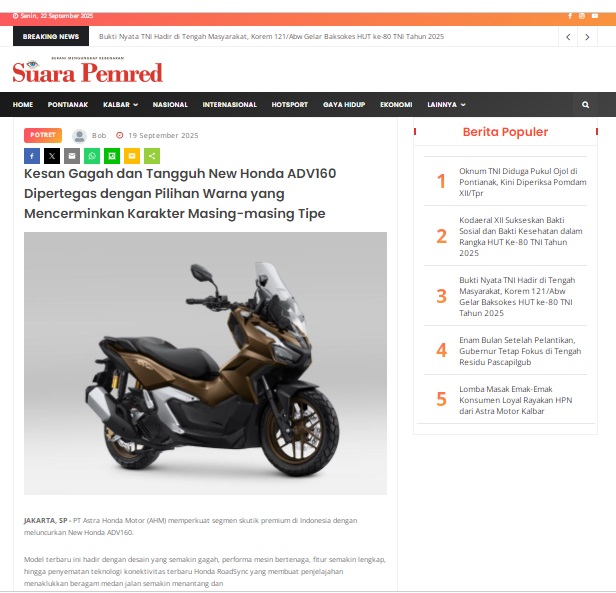 Kesan Gagah dan Tangguh New Honda ADV160 Dipertegas dengan Pilihan Warna yang Mencerminkan Karakter Masing-masing Tipe by masmul 19 September 2025 in Silahkan kunjungi https://www.suarapemredkalbar.com/read/potret/19092025/kesan-gagah-dan-tangguh-new-honda-adv160-dipertegas-dengan-pilihan-warna-yang-mencerminkan-karakter-masing-masing-tipe. You Might Like Regional Public Launching New ADV160 The SUV Pride Grand Launching New PCX 160 Truly Exceptional! Tetap hati-hati ya bro sist berkendara saat hujan.