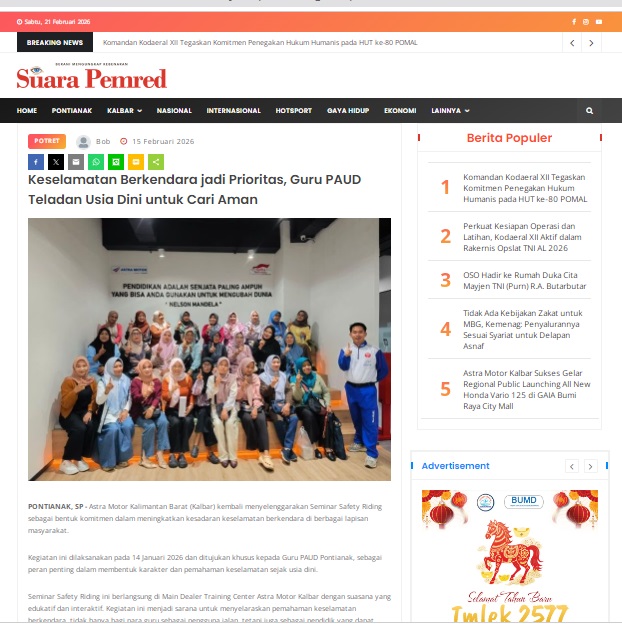 Keselamatan Berkendara jadi Prioritas, Guru PAUD Teladan Usia Dini untuk Cari Aman by masmul 15 Februari 2026 in Silahkan kunjungi https://www.suarapemredkalbar.com/read/potret/15022026/keselamatan-berkendara-jadi-prioritas-guru-paud-teladan-usia-dini-untuk-cari-aman. You Might Like Regional Public Launching New ADV160 The SUV Pride Grand Launching New PCX 160 Truly Exceptional! Tetap hati-hati ya bro sist berkendara saat hujan.