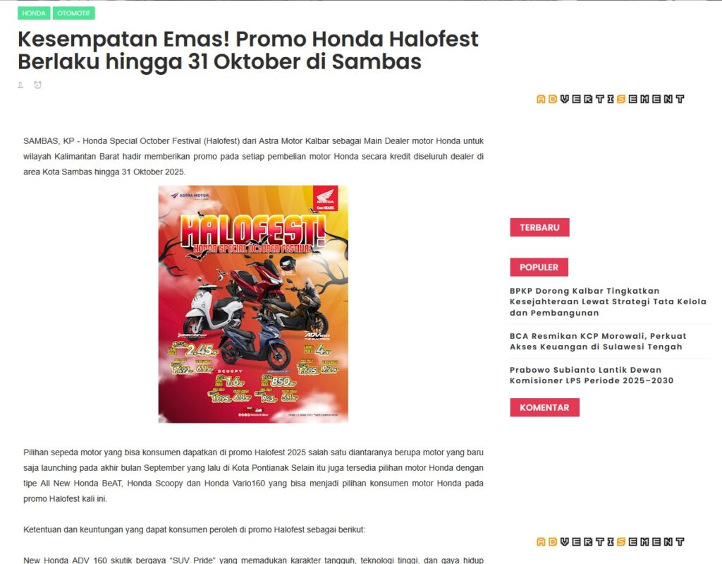 Kesempatan Emas! Promo Honda Halofest Berlaku hingga 31 Oktober di Sambas by Muhammad Arif 12 Oktober 2025 in Silahkan kunjungi https://www.kapuaspost.web.id/2025/10/kesempatan-emas-promo-honda-halofest.html. Tags: astra Astra Motor kalbar Astra Motor Pontianak astramotor honda kalbar pontianak sepeda motor You Might Like Regional Public Launching New ADV160 The SUV Pride Grand Launching New PCX 160 Truly Exceptional! Tetap hati-hati ya bro sist berkendara saat hujan.