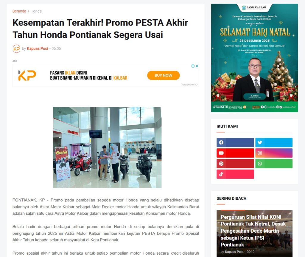 Kesempatan Terakhir! Promo PESTA Akhir Tahun Honda Pontianak Segera Usai by Muhammad Arif 29 Desember 2025 in Silahkan kunjungi https://www.kapuaspost.web.id/2025/12/kesempatan-terakhir-promo-pesta-akhir.html. Tags: astra Astra Motor kalbar Astra Motor Pontianak astramotor honda kalbar pontianak sepeda motor You Might Like Regional Public Launching New ADV160 The SUV Pride Grand Launching New PCX 160 Truly Exceptional! Tetap hati-hati ya bro sist berkendara saat hujan.