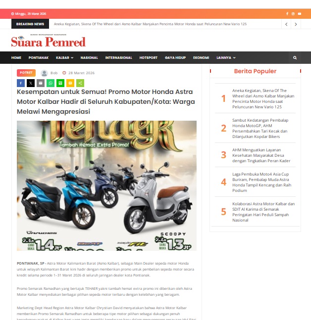 Kesempatan untuk Semua! Promo Motor Honda Astra Motor Kalbar Hadir di Seluruh Kabupaten/Kota: Warga Melawi Mengapresiasi by masmul 28 Maret 2026 in Silahkan kunjungi https://www.suarapemredkalbar.com/read/potret/28032026/kesempatan-untuk-semua-promo-motor-honda-astra-motor-kalbar-hadir-di-seluruh-kabupatenkota-warga-melawi-mengapresiasi. You Might Like Regional Public Launching New ADV160 The SUV Pride Grand Launching New PCX 160 Truly Exceptional! Tetap hati-hati ya bro sist berkendara saat hujan.
