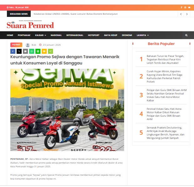Keuntungan Promo Sejiwa dengan Tawaran Menarik untuk Konsumen Loyal di Sanggau Photo of Keuntungan Promo Sejiwa dengan Tawaran Menarik untuk Konsumen Loyal di Sanggau by masmul 23 Januari 2026 in Silahkan kunjungi https://www.suarapemredkalbar.com/read/potret/23012026/keuntungan-promo-sejiwa-dengan-tawaran-menarik-untuk-konsumen-loyal-di-sanggau. You Might Like Regional Public Launching New ADV160 The SUV Pride Grand Launching New PCX 160 Truly Exceptional! Tetap hati-hati ya bro sist berkendara saat hujan.