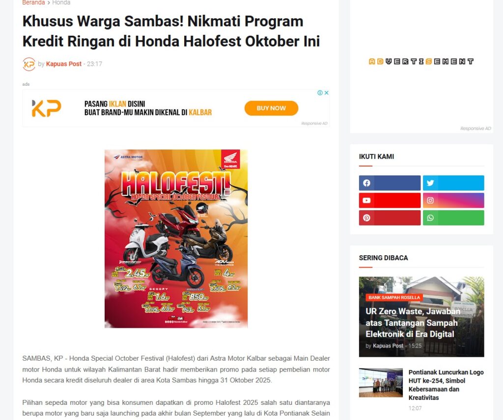 Khusus Warga Sambas! Nikmati Program Kredit Ringan di Honda Halofest Oktober Ini by Muhammad Arif 18 Oktober 2025 in Silahkan kunjungi https://www.kapuaspost.web.id/2025/10/khusus-warga-sambas-nikmati-program.html. Tags: astra Astra Motor kalbar Astra Motor Pontianak astramotor honda kalbar pontianak sepeda motor You Might Like Regional Public Launching New ADV160 The SUV Pride Grand Launching New PCX 160 Truly Exceptional! Tetap hati-hati ya bro sist berkendara saat hujan.