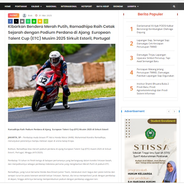 Kibarkan Bendera Merah Putih, Ramadhipa Raih Cetak Sejarah dengan Podium Perdana di Ajang European Talent Cup (ETC) Musim 2025 Sirkuit Estoril, Portugal by masmul 31 Mei 2025 in Silahkan kunjungi https://www.suarapemredkalbar.com/read/potret/31052025/kibarkan-bendera-merah-putih-ramadhipa-raih-cetak-sejarah-dengan-podium-perdana-di-ajang-european-talent-cup-etc-musim-2025-sirkuit-estoril-portugal. You Might Like Regional Public Launching New ADV160 The SUV Pride Grand Launching New PCX 160 Truly Exceptional! Tetap hati-hati ya bro sist berkendara saat hujan.