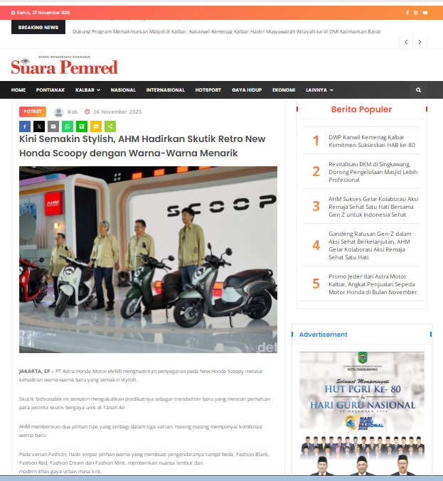 Kini Semakin Stylish, AHM Hadirkan Skutik Retro New Honda Scoopy dengan Warna-Warna Menarik by masmul 26 November 2025 in Silahkan kunjungi https://www.suarapemredkalbar.com/read/potret/26112025/kini-semakin-stylish-ahm-hadirkan-skutik-retro-new-honda-scoopy-dengan-warna-warna-menarik. You Might Like Regional Public Launching New ADV160 The SUV Pride Grand Launching New PCX 160 Truly Exceptional! Tetap hati-hati ya bro sist berkendara saat hujan.
