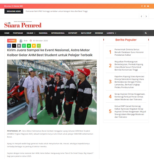 Kirim Juara Sampai ke Event Nasional, Astra Motor Kalbar Gelar AHM Best Student untuk Pelajar Terbaik by masmul 30 Oktober 2025 in Silahkan kunjungi https://www.suarapemredkalbar.com/read/potret/30102025/kirim-juara-sampai-ke-event-nasional-astra-motor-kalbar-gelar-ahm-best-student-untuk-pelajar-terbaik. You Might Like Regional Public Launching New ADV160 The SUV Pride Grand Launching New PCX 160 Truly Exceptional! Tetap hati-hati ya bro sist berkendara saat hujan.