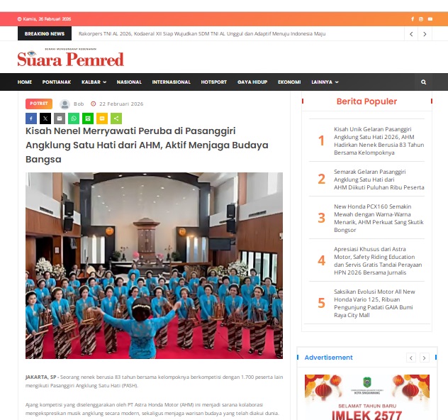 Kisah Nenel Merryawati Peruba di Pasanggiri Angklung Satu Hati dari AHM, Aktif Menjaga Budaya Bangsa by masmul 22 Februari 2026 in Silahkan kunjungi https://www.suarapemredkalbar.com/read/potret/22022026/kisah-nenel-merryawati-peruba-di-pasanggiri-angklung-satu-hati-dari-ahm-aktif-menjaga-budaya-bangsa. You Might Like Regional Public Launching New ADV160 The SUV Pride Grand Launching New PCX 160 Truly Exceptional! Tetap hati-hati ya bro sist berkendara saat hujan.