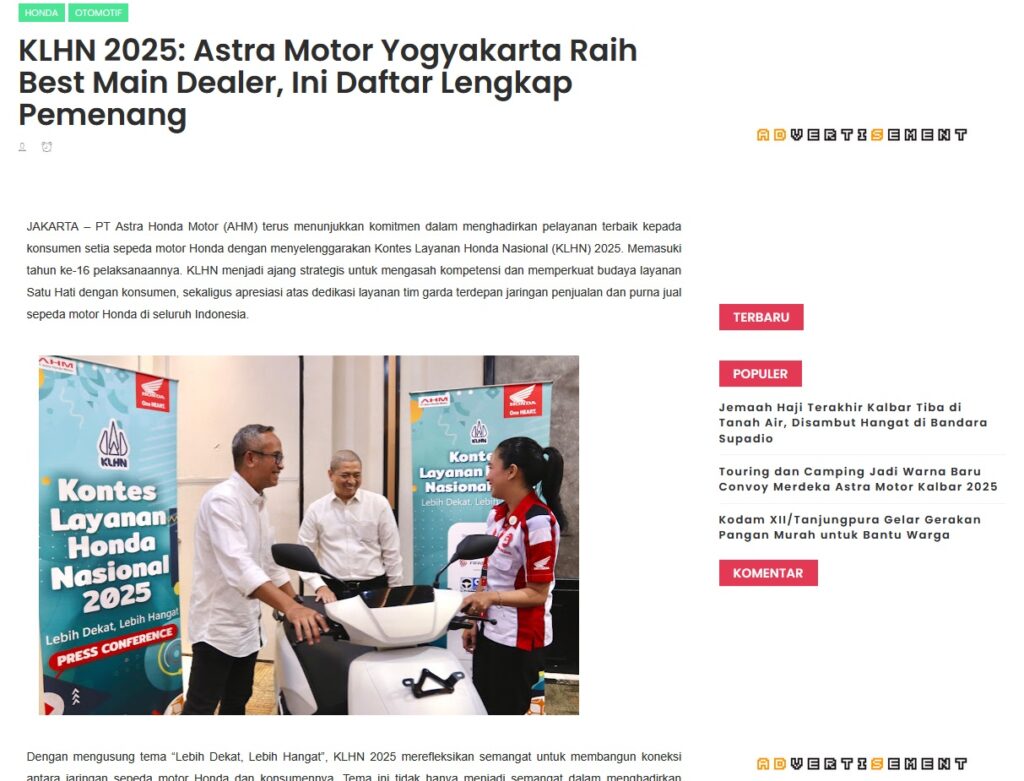 KLHN 2025: Astra Motor Yogyakarta Raih Best Main Dealer, Ini Daftar Lengkap Pemenang by Muhammad Arif 1 September 2025 in Silahkan kunjungi https://www.kapuaspost.web.id/2025/09/klhn-2025-astra-motor-yogyakarta-raih.html. Tags: astra Astra Motor kalbar Astra Motor Pontianak astramotor honda kalbar pontianak sepeda motor You Might Like Regional Public Launching New ADV160 The SUV Pride Grand Launching New PCX 160 Truly Exceptional! Tetap hati-hati ya bro sist berkendara saat hujan.