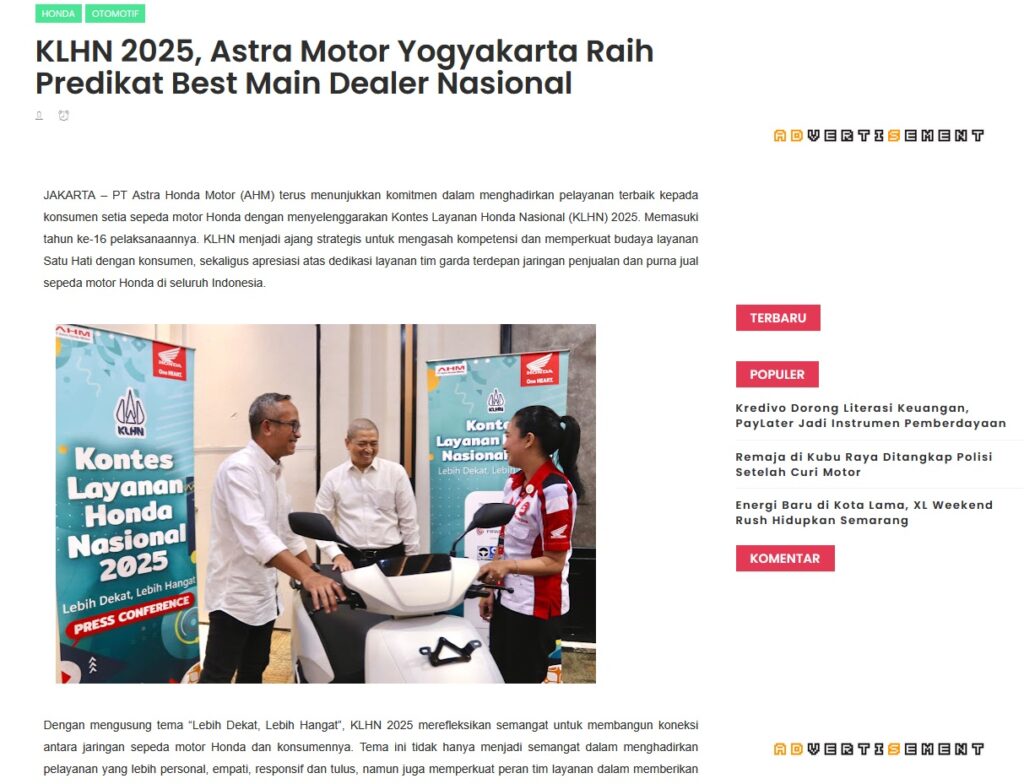 KLHN 2025, Astra Motor Yogyakarta Raih Predikat Best Main Dealer Nasional by Muhammad Arif 7 September 2025 in Silahkan kunjungi https://www.kapuaspost.web.id/2025/09/klhn-2025-astra-motor-yogyakarta-raih_21.html. Tags: astra Astra Motor kalbar Astra Motor Pontianak astramotor honda kalbar pontianak sepeda motor You Might Like Regional Public Launching New ADV160 The SUV Pride Grand Launching New PCX 160 Truly Exceptional! Tetap hati-hati ya bro sist berkendara saat hujan.
