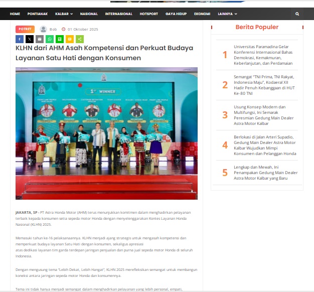 KLHN dari AHM Asah Kompetensi dan Perkuat Budaya Layanan Satu Hati dengan Konsumen by masmul 1 Oktober 2025 in Silahkan kunjungi https://www.suarapemredkalbar.com/read/potret/01102025/klhn-dari-ahm-asah-kompetensi-dan-perkuat-budaya-layanan-satu-hati-dengan-konsumen. You Might Like Regional Public Launching New ADV160 The SUV Pride Grand Launching New PCX 160 Truly Exceptional! Tetap hati-hati ya bro sist berkendara saat hujan.