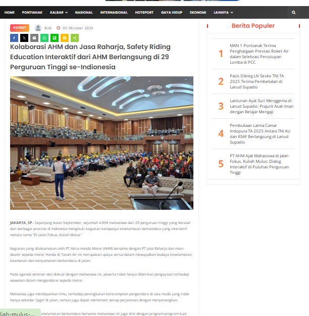 Kolaborasi AHM dan Jasa Raharja, Safety Riding Education Interaktif dari AHM Berlangsung di 29 Perguruan Tinggi se-Indionesia by masmul 5 Oktober 2025 in Silahkan kunjungi https://www.suarapemredkalbar.com/read/potret/05102025/kolaborasi-ahm-dan-jasa-raharja-safety-riding-education-interaktif-dari-ahm-berlangsung-di-29-perguruan-tinggi-se-indionesia. You Might Like Regional Public Launching New ADV160 The SUV Pride Grand Launching New PCX 160 Truly Exceptional! Tetap hati-hati ya bro sist berkendara saat hujan.
