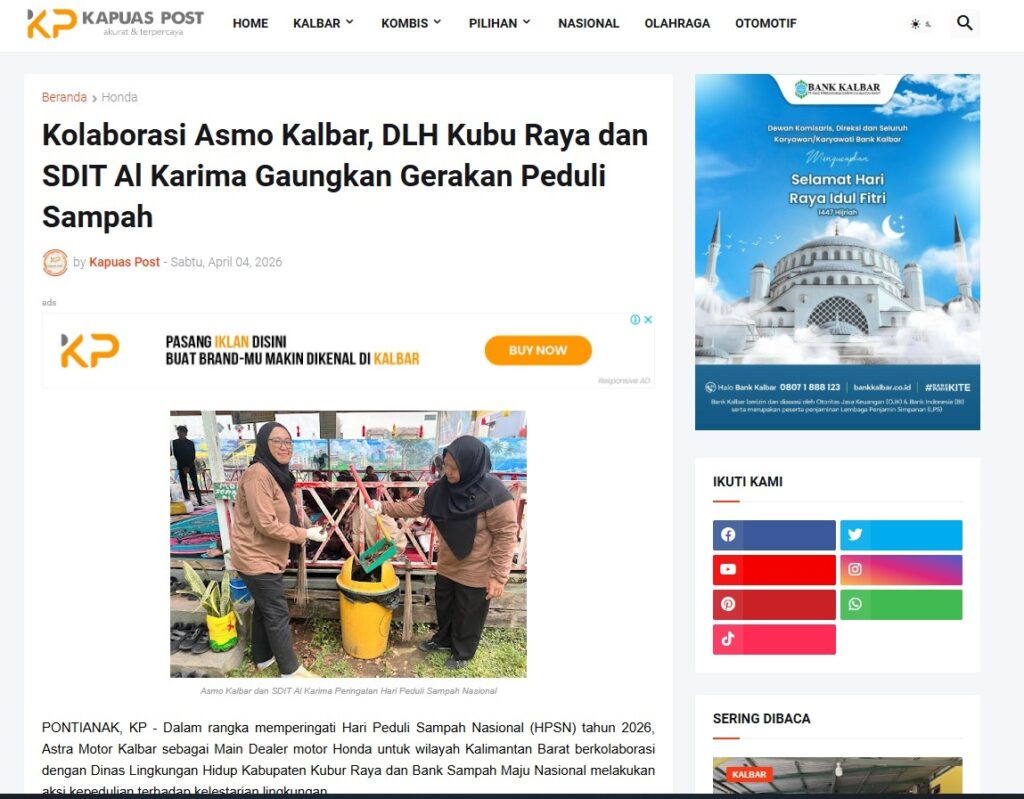 Kolaborasi Asmo Kalbar, DLH Kubu Raya dan SDIT Al Karima Gaungkan Gerakan Peduli Sampah by Muhammad Arif 4 April 2026 in Silahkan kunjungi https://www.kapuaspost.web.id/2026/04/kolaborasi-asmo-kalbar-dlh-kubu-raya.html. Tags: astra Astra Motor kalbar Astra Motor Pontianak astramotor honda kalbar pontianak sepeda motor You Might Like Regional Public Launching New ADV160 The SUV Pride Grand Launching New PCX 160 Truly Exceptional! Tetap hati-hati ya bro sist berkendara saat hujan.