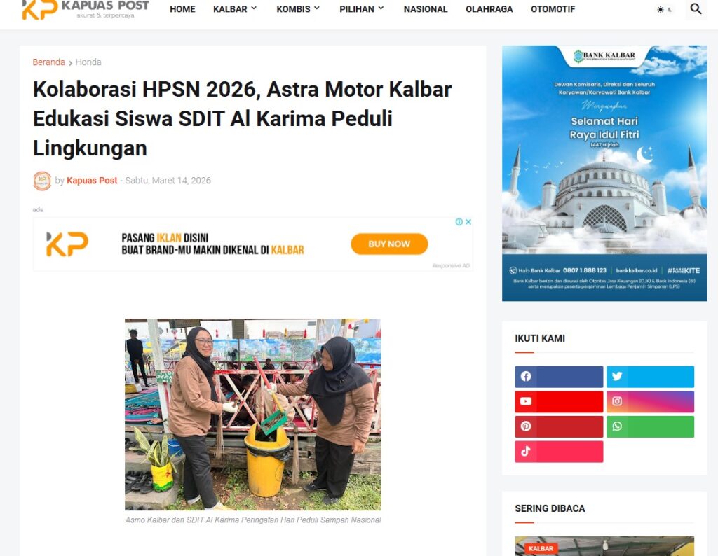 Kolaborasi HPSN 2026, Astra Motor Kalbar Edukasi Siswa SDIT Al Karima Peduli Lingkungan by Muhammad Arif 14 Maret 2026 in Silahkan kunjungi https://www.kapuaspost.web.id/2026/03/kolaborasi-hpsn-2026-astra-motor-kalbar.html. Tags: astra Astra Motor kalbar Astra Motor Pontianak astramotor honda kalbar pontianak sepeda motor You Might Like Regional Public Launching New ADV160 The SUV Pride Grand Launching New PCX 160 Truly Exceptional! Tetap hati-hati ya bro sist berkendara saat hujan.