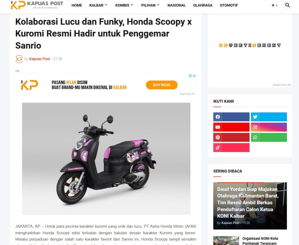 Kolaborasi Lucu dan Funky, Honda Scoopy x Kuromi Resmi Hadir untuk Penggemar Sanrio by Muhammad Arif 18 November 2025 in Silahkan kunjungi https://www.kapuaspost.web.id/2025/11/kolaborasi-lucu-dan-funky-honda-scoopy.html. Tags: astra Astra Motor kalbar Astra Motor Pontianak astramotor honda kalbar pontianak sepeda motor You Might Like Regional Public Launching New ADV160 The SUV Pride Grand Launching New PCX 160 Truly Exceptional! Tetap hati-hati ya bro sist berkendara saat hujan.