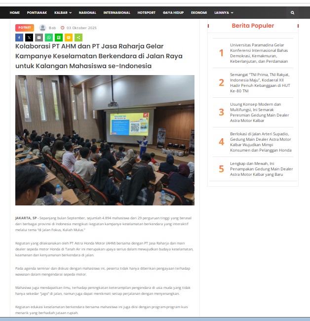 Kolaborasi PT AHM dan PT Jasa Raharja Gelar Kampanye Keselamatan Berkendara di Jalan Raya untuk Kalangan Mahasiswa se-Indonesia by masmul 3 Oktober 2025 in Silahkan kunjungi https://www.suarapemredkalbar.com/read/potret/03102025/kolaborasi-pt-ahm-dan-pt-jasa-raharja-gelar-kampanye-keselamatan-berkendara-di-jalan-raya-untuk-kalangan-mahasiswa-se-indonesia. You Might Like Regional Public Launching New ADV160 The SUV Pride Grand Launching New PCX 160 Truly Exceptional! Tetap hati-hati ya bro sist berkendara saat hujan.