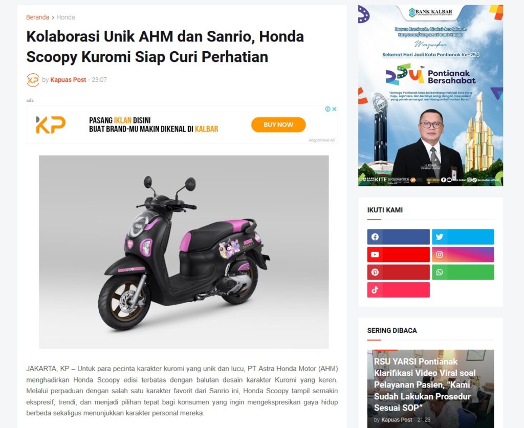 Kolaborasi Unik AHM dan Sanrio, Honda Scoopy Kuromi Siap Curi Perhatian by Muhammad Arif 29 Oktober 2025 in Silahkan kunjungi https://www.kapuaspost.web.id/2025/10/kolaborasi-unik-ahm-dan-sanrio-honda.html. Tags: astra Astra Motor kalbar Astra Motor Pontianak astramotor honda kalbar pontianak sepeda motor You Might Like Regional Public Launching New ADV160 The SUV Pride Grand Launching New PCX 160 Truly Exceptional! Tetap hati-hati ya bro sist berkendara saat hujan.