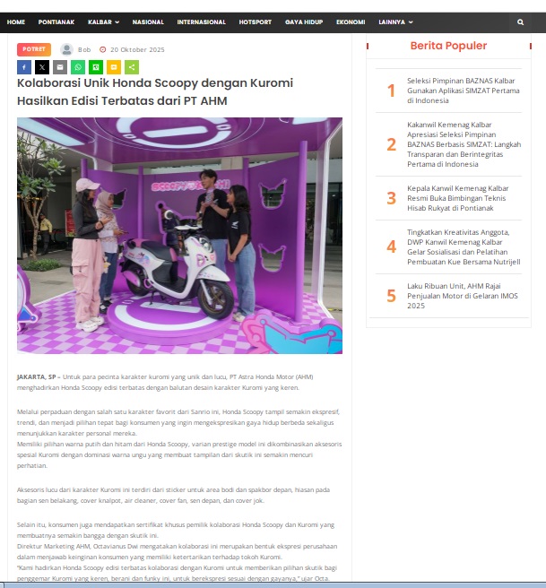 Kolaborasi Unik Honda Scoopy dengan Kuromi Hasilkan Edisi Terbatas dari PT AHM by masmul 20 Oktober 2025 in Silahkan kunjungi https://www.suarapemredkalbar.com/read/potret/20102025/kolaborasi-unik-honda-scoopy-dengan-kuromi-hasilkan-edisi-terbatas-dari-pt-ahm. You Might Like Regional Public Launching New ADV160 The SUV Pride Grand Launching New PCX 160 Truly Exceptional! Tetap hati-hati ya bro sist berkendara saat hujan.