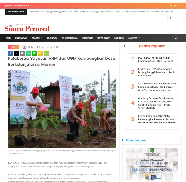 Kolaborasi Yayasan AHM dan UGM Kembangkan Desa Berkelanjutan di Merapi by masmul 24 November 2025 in Silahkan kunjungi https://www.suarapemredkalbar.com/read/potret/24112025/kolaborasi-yayasan-ahm-dan-ugm-kembangkan-desa-berkelanjutan-di-merapi. You Might Like Regional Public Launching New ADV160 The SUV Pride Grand Launching New PCX 160 Truly Exceptional! Tetap hati-hati ya bro sist berkendara saat hujan.
