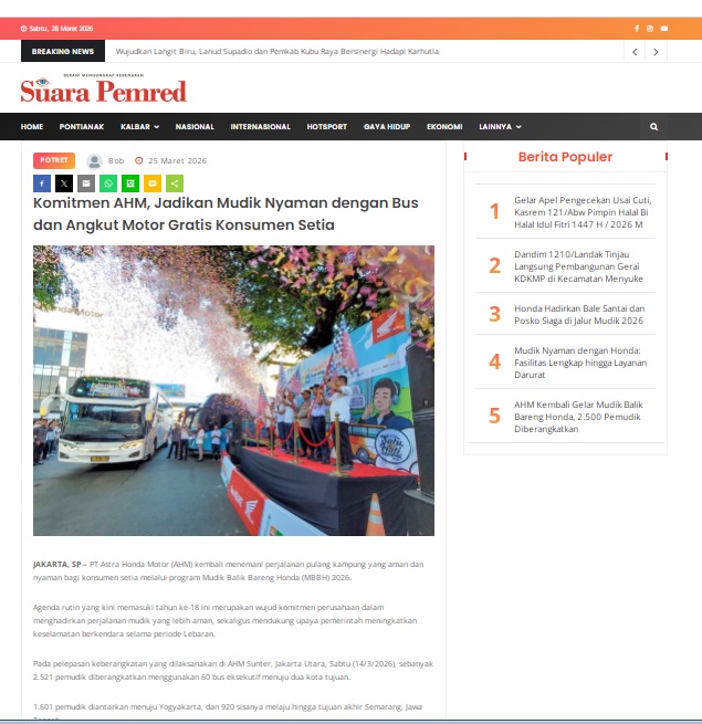 Komitmen AHM, Jadikan Mudik Nyaman dengan Bus dan Angkut Motor Gratis Konsumen Setia by masmul 25 Maret 2026 in Silahkan kunjungi https://www.suarapemredkalbar.com/read/potret/25032026/komitmen-ahm-jadikan-mudik-nyaman-dengan-bus-dan-angkut-motor-gratis-konsumen-setia. You Might Like Regional Public Launching New ADV160 The SUV Pride Grand Launching New PCX 160 Truly Exceptional! Tetap hati-hati ya bro sist berkendara saat hujan.
