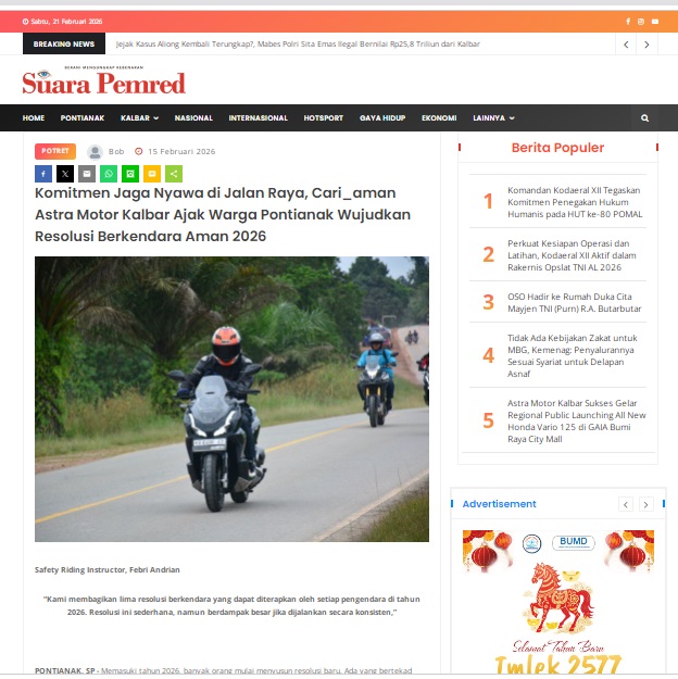 Komitmen Jaga Nyawa di Jalan Raya, Cari_aman Astra Motor Kalbar Ajak Warga Pontianak Wujudkan Resolusi Berkendara Aman 2026 by masmul 15 Februari 2026 in Silahkan kunjungi https://www.suarapemredkalbar.com/read/potret/15022026/komitmen-jaga-nyawa-di-jalan-raya-cari_aman-astra-motor-kalbar-ajak-warga-pontianak-wujudkan-resolusi-berkendara-aman-2026. You Might Like Regional Public Launching New ADV160 The SUV Pride Grand Launching New PCX 160 Truly Exceptional! Tetap hati-hati ya bro sist berkendara saat hujan.