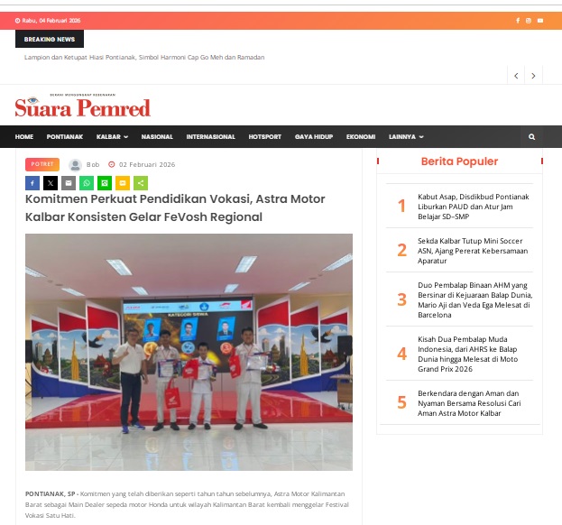 Komitmen Perkuat Pendidikan Vokasi, Astra Motor Kalbar Konsisten Gelar FeVosh Regional by masmul 2 Februari 2026 in Silahkan kunjungi https://www.suarapemredkalbar.com/read/potret/02022026/komitmen-perkuat-pendidikan-vokasi-astra-motor-kalbar-konsisten-gelar-fevosh-regional. You Might Like Regional Public Launching New ADV160 The SUV Pride Grand Launching New PCX 160 Truly Exceptional! Tetap hati-hati ya bro sist berkendara saat hujan.
