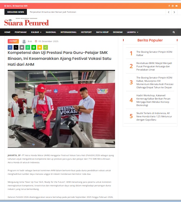 Kompetensi dan Uji Prestasi Para Guru-Pelajar SMK Binaan, Ini Kesemarakkan Ajang Festival Vokasi Satu Hati dari AHM by masmul 5 Desember 2025 in Silahkan kunjungi https://www.suarapemredkalbar.com/read/potret/05122025/kompetensi-dan-uji-prestasi-para-guru-pelajar-smk-binaan-ini-kesemarakkan-ajang-festival-vokasi-satu-hati-dari-ahm. You Might Like Regional Public Launching New ADV160 The SUV Pride Grand Launching New PCX 160 Truly Exceptional! Tetap hati-hati ya bro sist berkendara saat hujan.