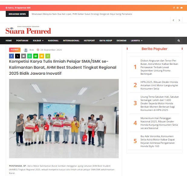 Kompetisi Karya Tulis Ilmiah Pelajar SMA/SMK se-Kalimantan Barat, AHM Best Student Tingkat Regional 2025 Bidik Jawara Inovatif by masmul 24 September 2025 in Silahkan kunjungi https://www.suarapemredkalbar.com/read/potret/24092025/kompetisi-karya-tulis-ilmiah-pelajar-smasmk-se-kalimantan-barat-ahm-best-student-tingkat-regional-2025-bidik-jawara-inovatif. You Might Like Regional Public Launching New ADV160 The SUV Pride Grand Launching New PCX 160 Truly Exceptional! Tetap hati-hati ya bro sist berkendara saat hujan.
