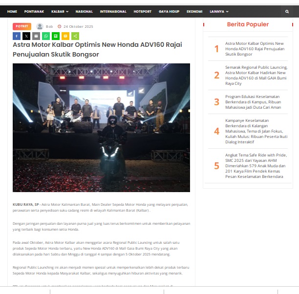 Kompetisi Karya Tulis Ilmiah untuk Pelajar, Seleksi AHM Best Student Tingkat Regional 2025 Astra Motor Kalbar Berlangsung Semarak by masmul 24 Oktober 2025 in Silahkan kunjungi https://www.suarapemredkalbar.com/read/potret/24102025/kompetisi-karya-tulis-ilmiah-untuk-pelajar-seleksi-ahm-best-student-tingkat-regional-2025-astra-motor-kalbar-berlangsung-semarak. You Might Like Regional Public Launching New ADV160 The SUV Pride Grand Launching New PCX 160 Truly Exceptional! Tetap hati-hati ya bro sist berkendara saat hujan.
