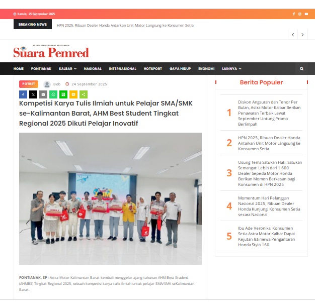 Kompetisi Karya Tulis Ilmiah untuk Pelajar SMA/SMK se-Kalimantan Barat, AHM Best Student Tingkat Regional 2025 Dikuti Pelajar Inovatif by masmul 24 September 2025 in Silahkan kunjungi https://www.suarapemredkalbar.com/read/potret/24092025/kompetisi-karya-tulis-ilmiah-untuk-pelajar-smasmk-se-kalimantan-barat-ahm-best-student-tingkat-regional-2025-dikuti-pelajar-inovatif. You Might Like Regional Public Launching New ADV160 The SUV Pride Grand Launching New PCX 160 Truly Exceptional! Tetap hati-hati ya bro sist berkendara saat hujan.