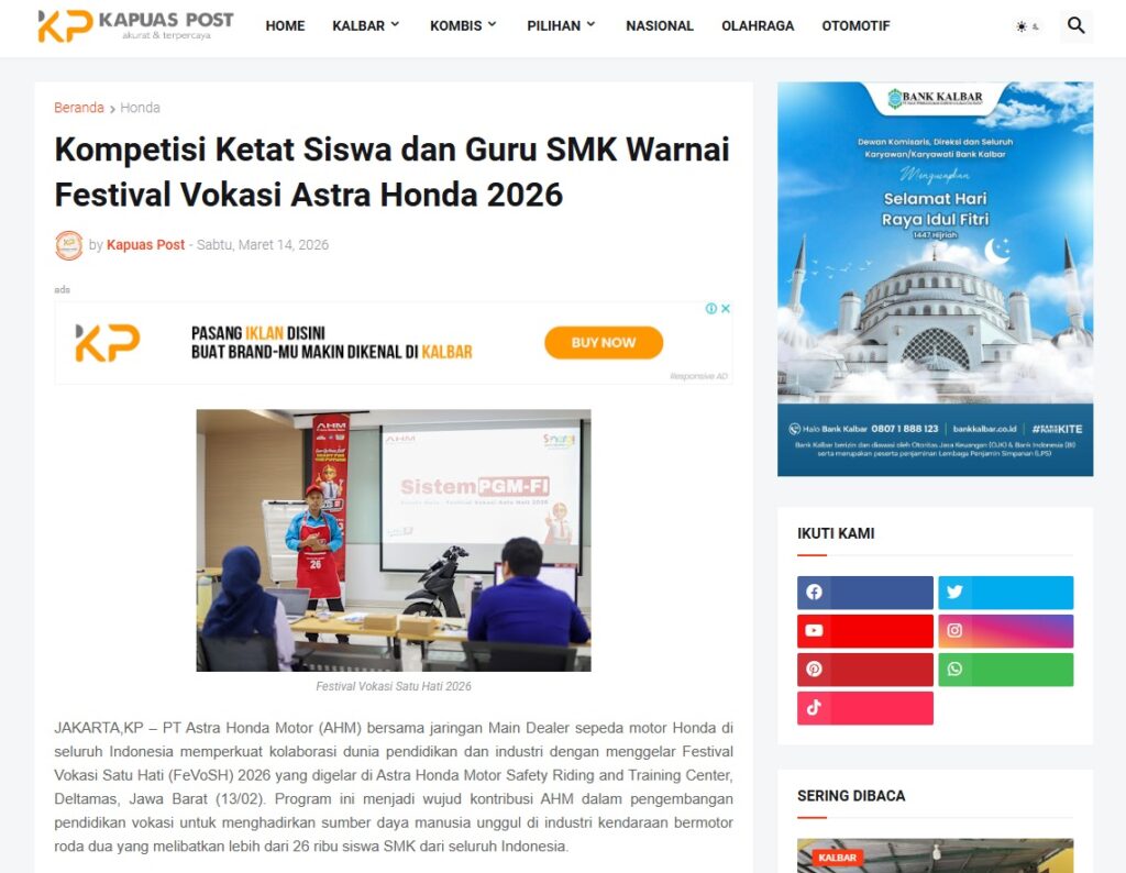 Kompetisi Ketat Siswa dan Guru SMK Warnai Festival Vokasi Astra Honda 2026 by Muhammad Arif 14 Maret 2026 in Silahkan kunjungi https://www.kapuaspost.web.id/2026/03/kompetisi-ketat-siswa-dan-guru-smk.html. Tags: astra Astra Motor kalbar Astra Motor Pontianak astramotor honda kalbar pontianak sepeda motor You Might Like Regional Public Launching New ADV160 The SUV Pride Grand Launching New PCX 160 Truly Exceptional! Tetap hati-hati ya bro sist berkendara saat hujan.