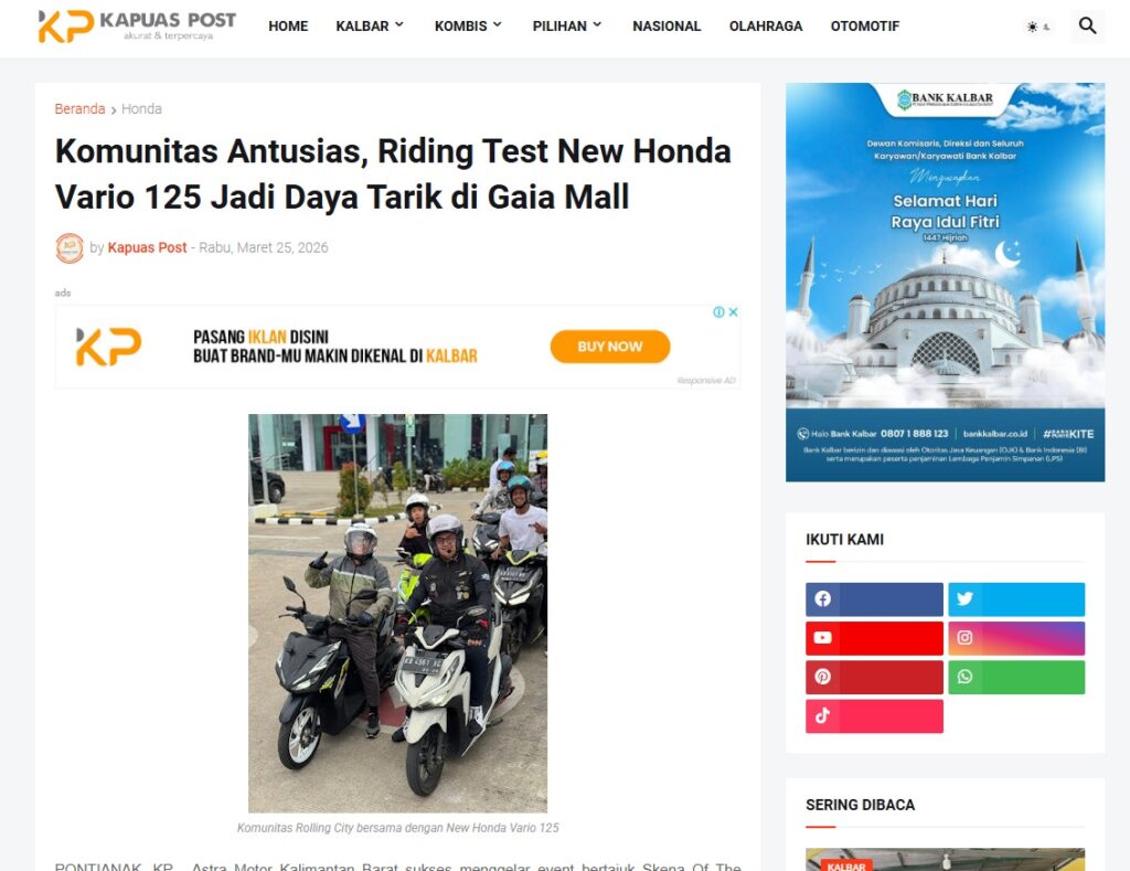 Komunitas Antusias, Riding Test New Honda Vario 125 Jadi Daya Tarik di Gaia Mall by Muhammad Arif 25 Maret 2026 in Silahkan kunjungi https://www.kapuaspost.web.id/2026/03/komunitas-antusias-riding-test-new.html. Tags: astra Astra Motor kalbar Astra Motor Pontianak astramotor honda kalbar pontianak sepeda motor You Might Like Regional Public Launching New ADV160 The SUV Pride Grand Launching New PCX 160 Truly Exceptional! Tetap hati-hati ya bro sist berkendara saat hujan.
