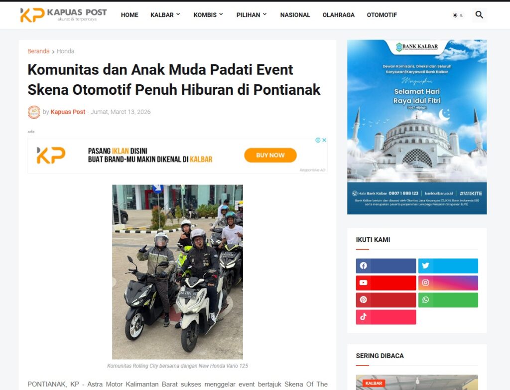 Komunitas dan Anak Muda Padati Event Skena Otomotif Penuh Hiburan di Pontianak by Muhammad Arif 13 Maret 2026 in Silahkan kunjungi https://www.kapuaspost.web.id/2026/03/komunitas-dan-anak-muda-padati-event.html. Tags: astra Astra Motor kalbar Astra Motor Pontianak astramotor honda kalbar pontianak sepeda motor You Might Like Regional Public Launching New ADV160 The SUV Pride Grand Launching New PCX 160 Truly Exceptional! Tetap hati-hati ya bro sist berkendara saat hujan.
