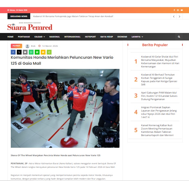 Komunitas Honda Meriahkan Peluncuran New Vario 125 di Gaia Mall by masmul 14 Maret 2026 in Silahkan kunjungi https://www.suarapemredkalbar.com/read/potret/14032026/komunitas-honda-meriahkan-peluncuran-new-vario-125-di-gaia-mall. You Might Like Regional Public Launching New ADV160 The SUV Pride Grand Launching New PCX 160 Truly Exceptional! Tetap hati-hati ya bro sist berkendara saat hujan.