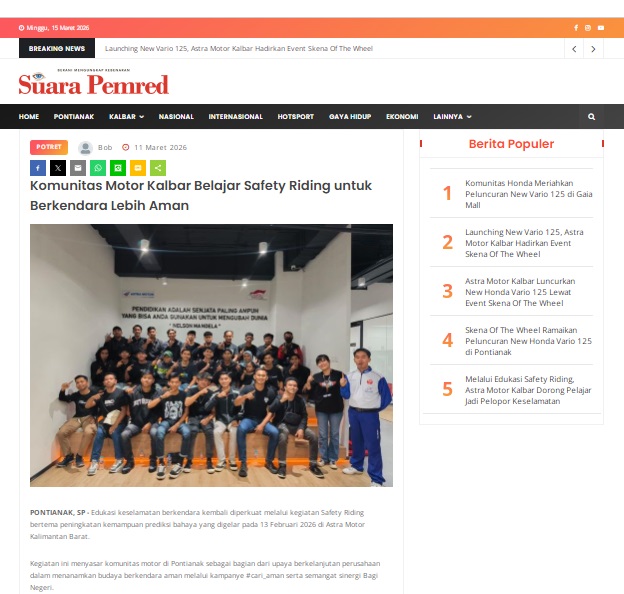 Komunitas Motor Kalbar Belajar Safety Riding untuk Berkendara Lebih Aman by masmul 11 Maret 2026 in Silahkan kunjungi https://www.suarapemredkalbar.com/read/potret/11032026/komunitas-motor-kalbar-belajar-safety-riding-untuk-berkendara-lebih-aman. You Might Like Regional Public Launching New ADV160 The SUV Pride Grand Launching New PCX 160 Truly Exceptional! Tetap hati-hati ya bro sist berkendara saat hujan.
