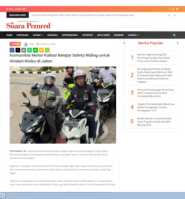 Komunitas Motor Kalbar Belajar Safety Riding untuk Hindari Risiko di Jalan by masmul 3 Maret 2026 in Silahkan kunjungi https://www.suarapemredkalbar.com/read/potret/03032026/komunitas-motor-kalbar-belajar-safety-riding-untuk-hindari-risiko-di-jalan. You Might Like Regional Public Launching New ADV160 The SUV Pride Grand Launching New PCX 160 Truly Exceptional! Tetap hati-hati ya bro sist berkendara saat hujan.