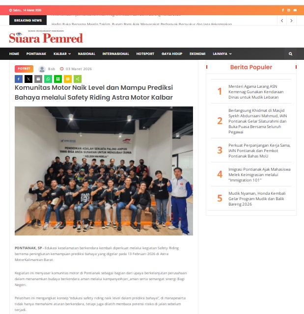 Komunitas Motor Naik Level dan Mampu Prediksi Bahaya melalui Safety Riding Astra Motor Kalbar by masmul 3 Maret 2026 in Silahkan kunjungi https://www.suarapemredkalbar.com/read/potret/03032026/komunitas-motor-naik-level-dan-mampu-prediksi-bahaya-melalui-safety-riding-astra-motor-kalbar. You Might Like Regional Public Launching New ADV160 The SUV Pride Grand Launching New PCX 160 Truly Exceptional! Tetap hati-hati ya bro sist berkendara saat hujan.