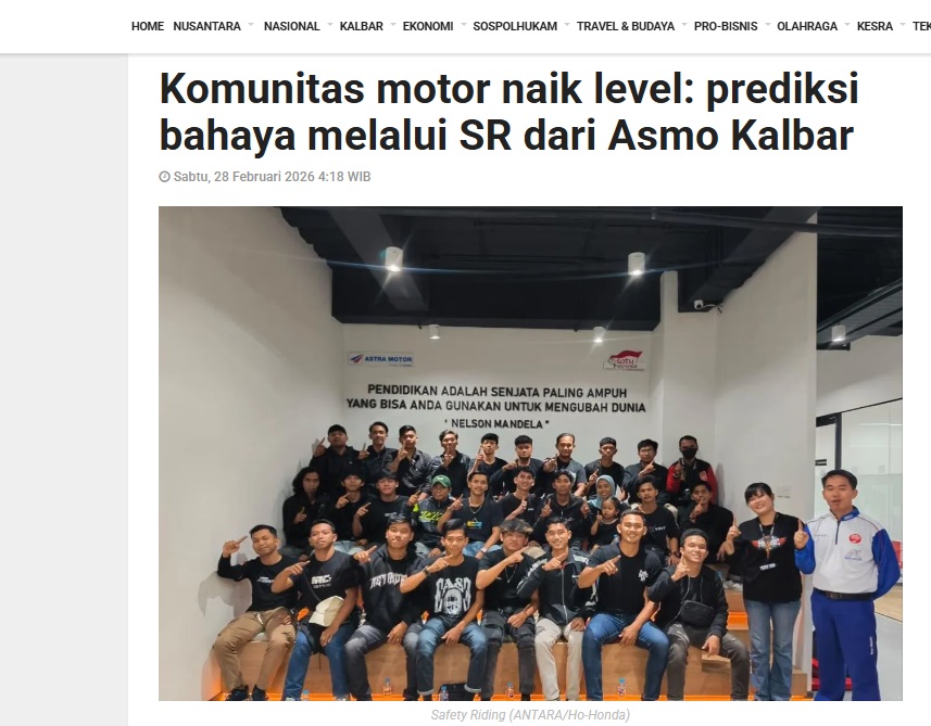 Komunitas motor naik level: prediksi bahaya melalui SR dari Asmo Kalbar by Dedi 28 Februari 2026 in Silahkan kunjungi https://kalbar.antaranews.com/berita/691738/komunitas-motor-naik-level-prediksi-bahaya-melalui-sr-dari-asmo-kalbar. You Might Like Regional Public Launching New ADV160 The SUV Pride Grand Launching New PCX 160 Truly Exceptional! Tetap hati-hati ya bro sist berkendara saat hujan.