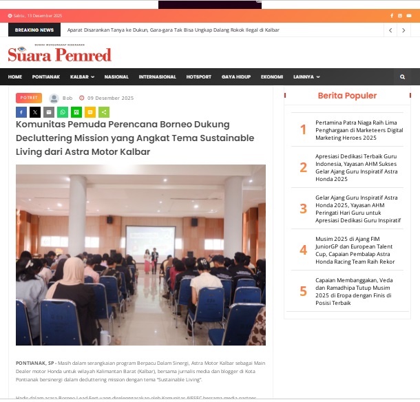Komunitas Pemuda Perencana Borneo Dukung Decluttering Mission yang Angkat Tema Sustainable Living dari Astra Motor Kalbar by masmul 9 Desember 2025 in Silahkan kunjungi https://www.suarapemredkalbar.com/read/potret/09122025/komunitas-pemuda-perencana-borneo-dukung-decluttering-mission-yang-angkat-tema-sustainable-living-dari-astra-motor-kalbar. You Might Like Regional Public Launching New ADV160 The SUV Pride Grand Launching New PCX 160 Truly Exceptional! Tetap hati-hati ya bro sist berkendara saat hujan.