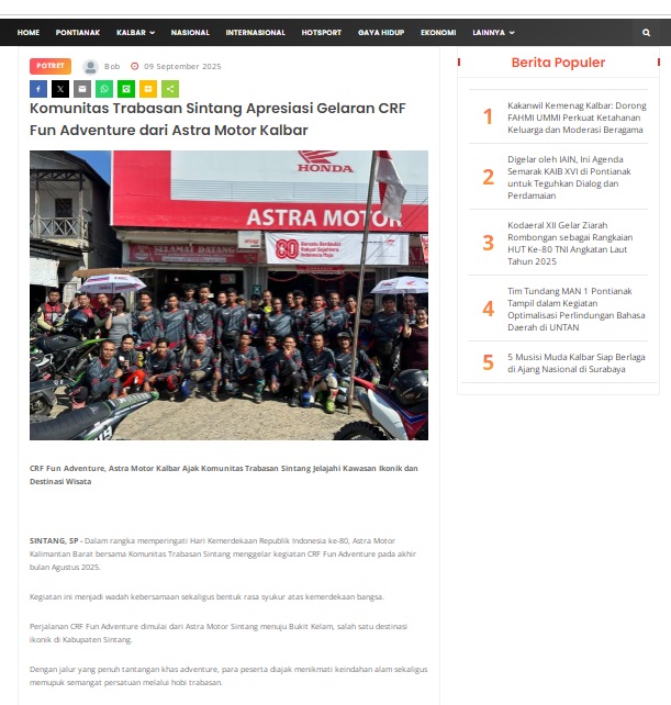 Komunitas Trabasan Sintang Apresiasi Gelaran CRF Fun Adventure dari Astra Motor Kalbar by masmul 9 September 2025 in Silahkan kunjungi https://www.suarapemredkalbar.com/read/potret/09092025/komunitas-trabasan-sintang-apresiasi-gelaran-crf-fun-adventure-dari-astra-motor-kalbar. You Might Like Regional Public Launching New ADV160 The SUV Pride Grand Launching New PCX 160 Truly Exceptional! Tetap hati-hati ya bro sist berkendara saat hujan.