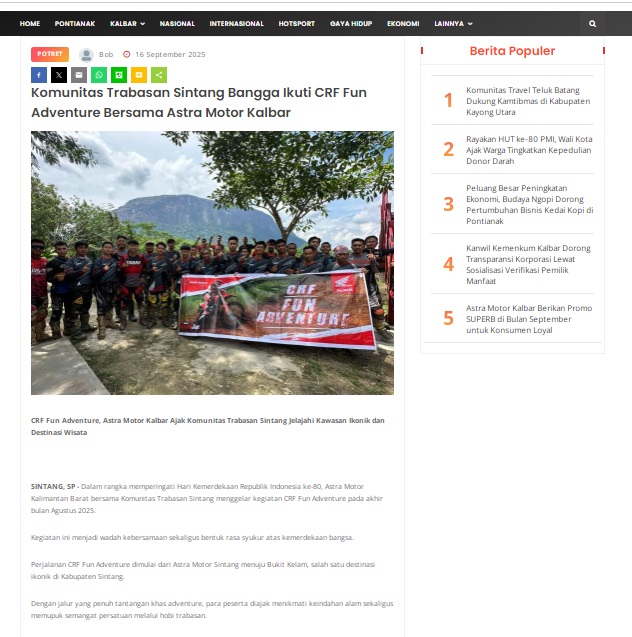 Komunitas Trabasan Sintang Bangga Ikuti CRF Fun Adventure Bersama Astra Motor Kalbar by masmul 16 September 2025 in Silahkan kunjungi https://www.suarapemredkalbar.com/read/potret/16092025/komunitas-trabasan-sintang-bangga-ikuti-crf-fun-adventure-bersama-astra-motor-kalbar. You Might Like Regional Public Launching New ADV160 The SUV Pride Grand Launching New PCX 160 Truly Exceptional! Tetap hati-hati ya bro sist berkendara saat hujan.