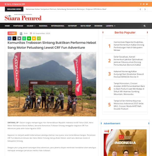 Komunitas Trabasan Sintang Buktikan Performa Hebat Sang Motor Petualang Lewat CRF Fun Adventure by masmul 3 September 2025 in Silahkan kunjungi https://www.suarapemredkalbar.com/read/potret/03092025/komunitas-trabasan-sintang-buktikan-performa-hebat-sang-motor-petualang-lewat-crf-fun-adventure. You Might Like Regional Public Launching New ADV160 The SUV Pride Grand Launching New PCX 160 Truly Exceptional! Tetap hati-hati ya bro sist berkendara saat hujan.