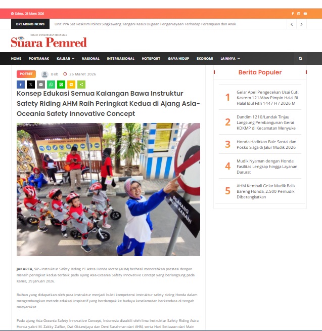 Konsep Edukasi Semua Kalangan Bawa Instruktur Safety Riding AHM Raih Peringkat Kedua di Ajang Asia-Oceania Safety Innovative Concept by masmul 26 Maret 2026 in Silahkan kunjungi https://www.suarapemredkalbar.com/read/potret/26032026/konsep-edukasi-semua-kalangan-bawa-instruktur-safety-riding-ahm-raih-peringkat-keduadi-ajang-asia-oceania-safety-innovative-concept. You Might Like Regional Public Launching New ADV160 The SUV Pride Grand Launching New PCX 160 Truly Exceptional! Tetap hati-hati ya bro sist berkendara saat hujan.