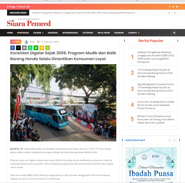 Konsisten Digelar Sejak 2008, Program Mudik dan Balik Bareng Honda Selalu Dinantikan Konsumen Loyal by masmul 16 Februari 2026 in Silahkan kunjungi https://www.suarapemredkalbar.com/read/potret/16022026/konsisten-digelar-sejak-2008-program-mudik-dan-balik-bareng-honda-selalu-dinantikan-konsumen-loyal. You Might Like Regional Public Launching New ADV160 The SUV Pride Grand Launching New PCX 160 Truly Exceptional! Tetap hati-hati ya bro sist berkendara saat hujan.