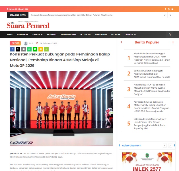 Konsisten Perkuat Dukungan pada Pembinaan Balap Nasional, Pembalap Binaan AHM Siap Melaju di MotoGP 2026 by masmul 24 Februari 2026 in Silahkan kunjungi https://www.suarapemredkalbar.com/read/potret/24022026/konsisten-perkuat-dukungan-pada-pembinaan-balap-nasional-pembalap-binaan-ahm-siap-melaju-di-motogp-2026. You Might Like Regional Public Launching New ADV160 The SUV Pride Grand Launching New PCX 160 Truly Exceptional! Tetap hati-hati ya bro sist berkendara saat hujan.