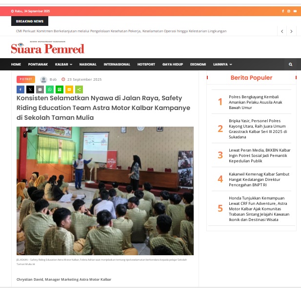 Konsisten Selamatkan Nyawa di Jalan Raya, Safety Riding Education Team Astra Motor Kalbar Kampanye di Sekolah Taman Mulia by masmul 23 September 2025 in Silahkan kunjungi https://www.suarapemredkalbar.com/read/potret/23092025/konsisten-selamatkan-nyawa-di-jalan-raya-safety-riding-education-team-astra-motor-kalbar-kampanye-di-sekolah-taman-mulia. You Might Like Regional Public Launching New ADV160 The SUV Pride Grand Launching New PCX 160 Truly Exceptional! Tetap hati-hati ya bro sist berkendara saat hujan.