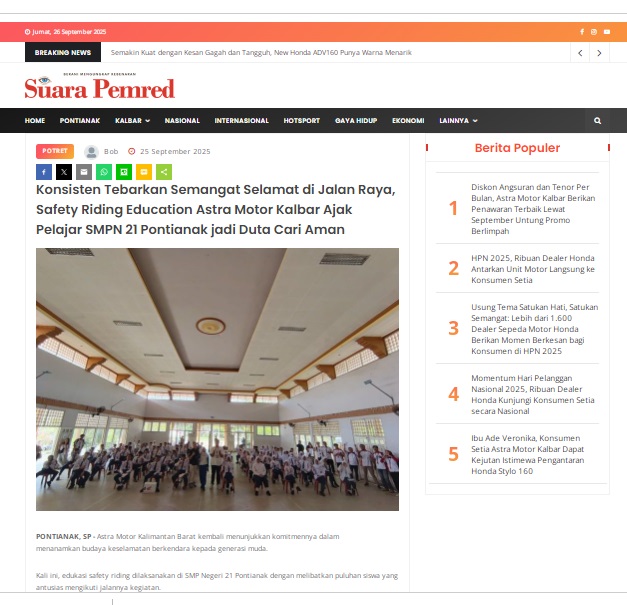 Konsisten Tebarkan Semangat Selamat di Jalan Raya, Safety Riding Education Astra Motor Kalbar Ajak Pelajar SMPN 21 Pontianak jadi Duta Cari Aman by masmul 25 September 2025 in Silahkan kunjungi https://www.suarapemredkalbar.com/read/potret/25092025/konsisten-tebarkan-semangat-selamat-di-jalan-raya-safety-riding-education-astra-motor-kalbar-ajak-pelajar-smpn-21-pontianak-jadi-duta-cari-aman. You Might Like Regional Public Launching New ADV160 The SUV Pride Grand Launching New PCX 160 Truly Exceptional! Tetap hati-hati ya bro sist berkendara saat hujan.